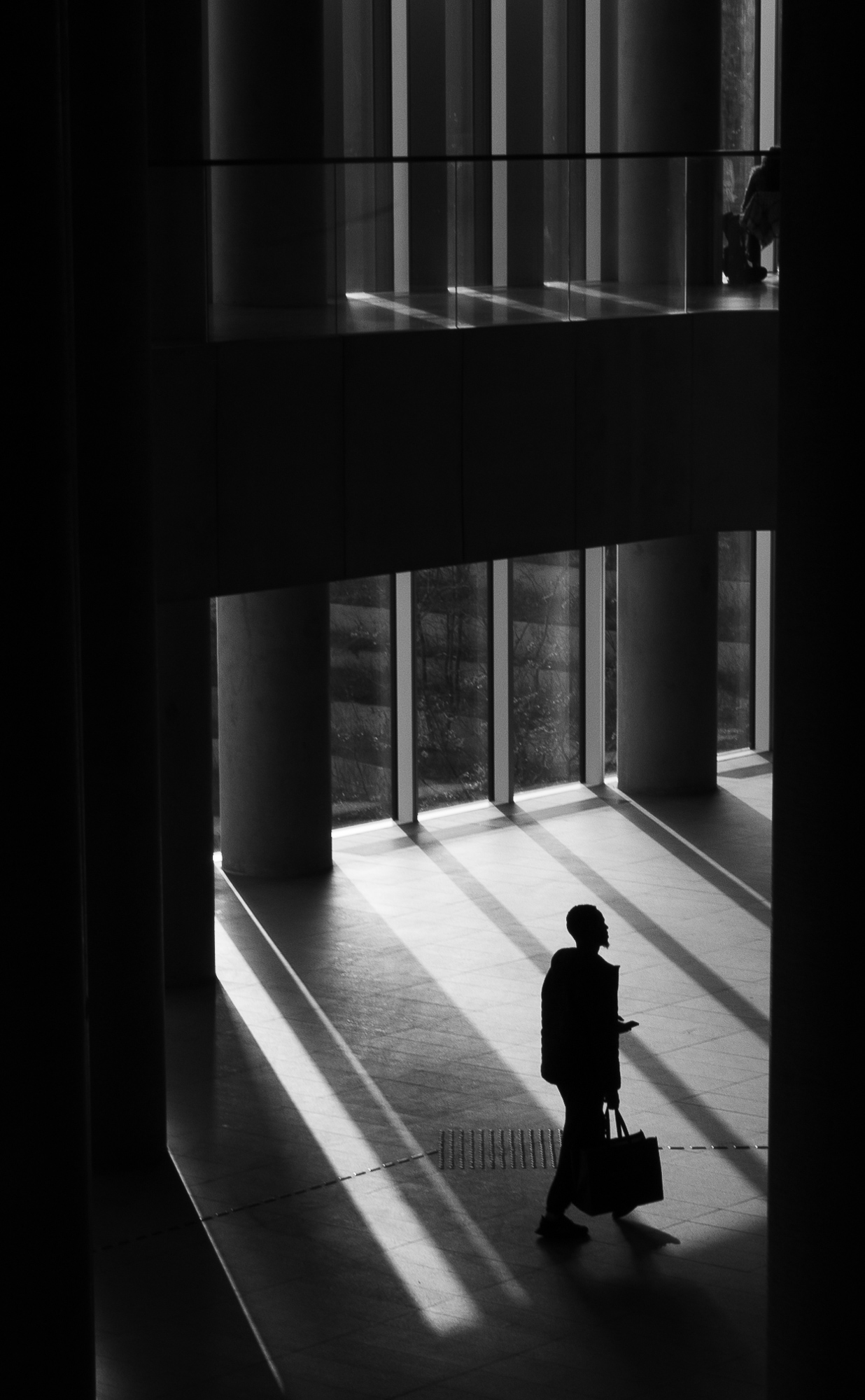 Ein Moment des Lichts, gefasst zwischen Glas, Beton und Bewegung. Eine Person durchschreitet das Raster des Nachmittagslichts – getragen von Linien, Schatten und der Stille des Raums. Das Bild zeigt nicht den Weg, sondern das, was ihn sichtbar macht: Licht als architektonisches Material.