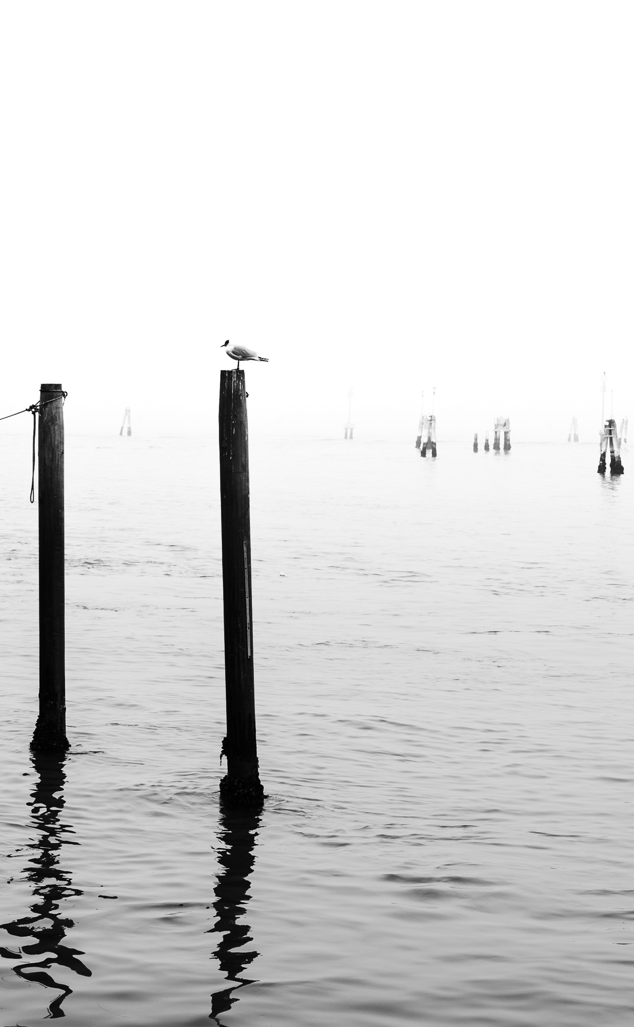 Eine Möwe auf einem alten Pfahl in der Lagune von Venedig. Das Wasser ruht, der Himmel löst sich im Weiß auf. Ein stiller Moment zwischen Raum und Zeit, in dem das Motiv selbst zu verschwinden scheint – als würde nur das Gleichgewicht aus Licht und Wasser bleiben.